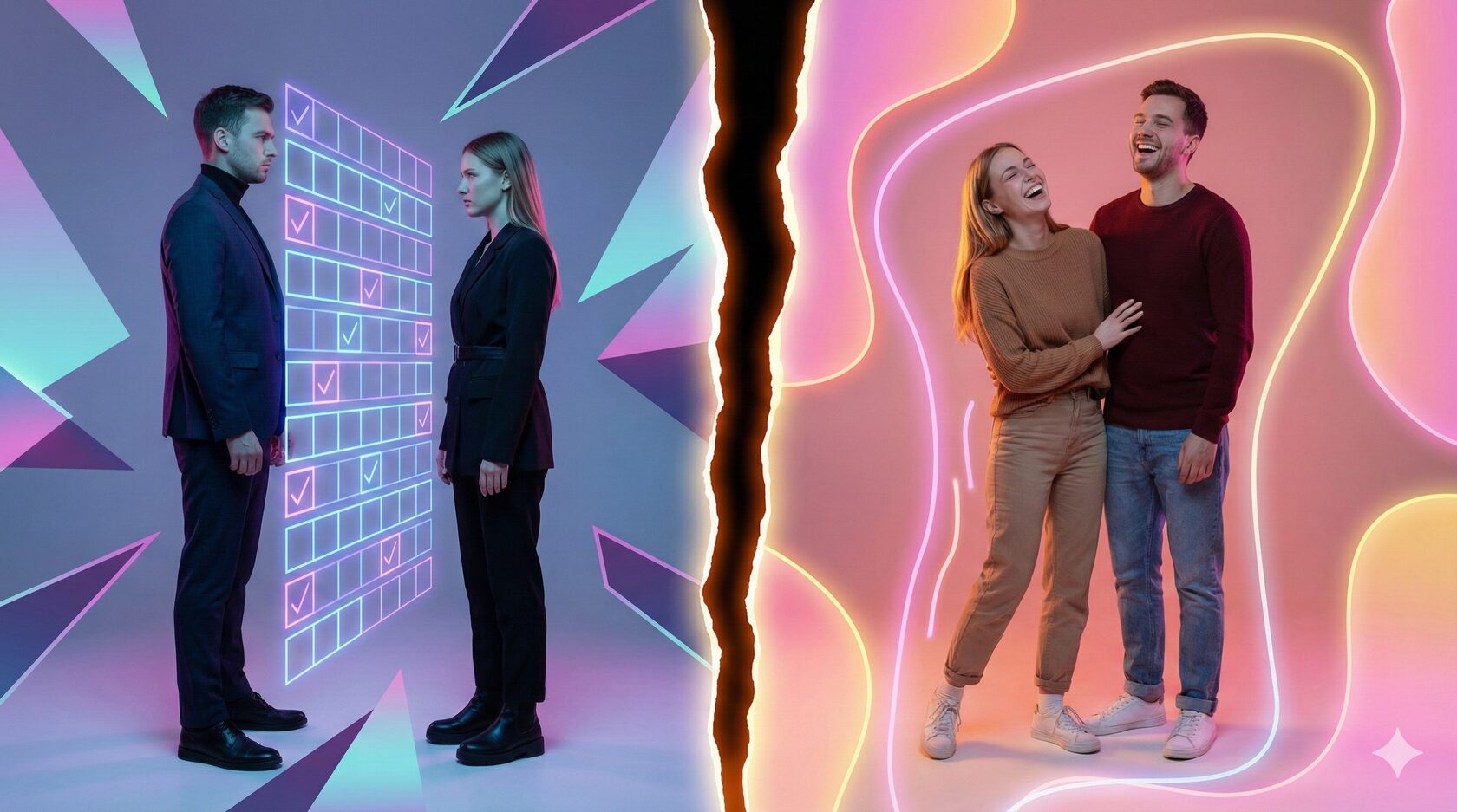 Риск 2: KPI-близость и утрата спонтанности. Другой перекос — попытка измерять и оценивать отношения так, будто это бизнес-проект. Например, человек вводит десяток новых привычек и затем ожидает немедленного улучшения «показателей счастья», расстраивается, если в календаре не выполнено условных «5 из 7 запланированных свиданий». Любовь — сфера более тонкая: её нельзя загнать в Excel. Если фокус смещается с качества связи на количественные показатели, живое чувство увядает. Партнёры начинают чувствовать себя участниками эксперимента или подопытными проекта, а не спонтанно любящими людьми. В продюсерском подходе важно оставаться гибким: да, мы проектируем среду для близости, но сама близость — не продукт по расписанию. Она может вспыхнуть нежданно, а может и не проявиться там, где «по плану» романтический ужин (особенно если выполнять его как обязаловку). Поэтому никакие ритуалы не должны становиться догмой. Их роль — облегчать контакт, а не быть самоцелью.